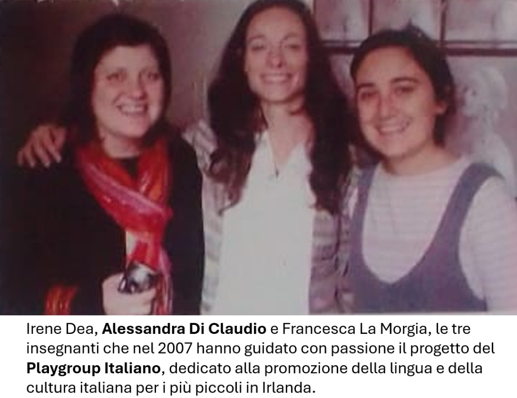 Il Playgroup Italiano nasce nel 2006 come iniziativa spontanea tra genitori italiani che volevano mantenere viva la lingua madre nei propri figli nati o cresciuti in Irlanda. È diventato presto un progetto strutturato, con attività educative e ludiche in italiano rivolte ai bambini e alle famiglie. Dopo qualche anno è stato riconosciuto con il European Language Label, come uno dei progetti linguistici più significativi in Irlanda. È stata una grande soddisfazione: abbiamo dimostrato che si può promuovere la lingua e la cultura italiana anche fuori dai confini nazionali, in modo giocoso e inclusivo.